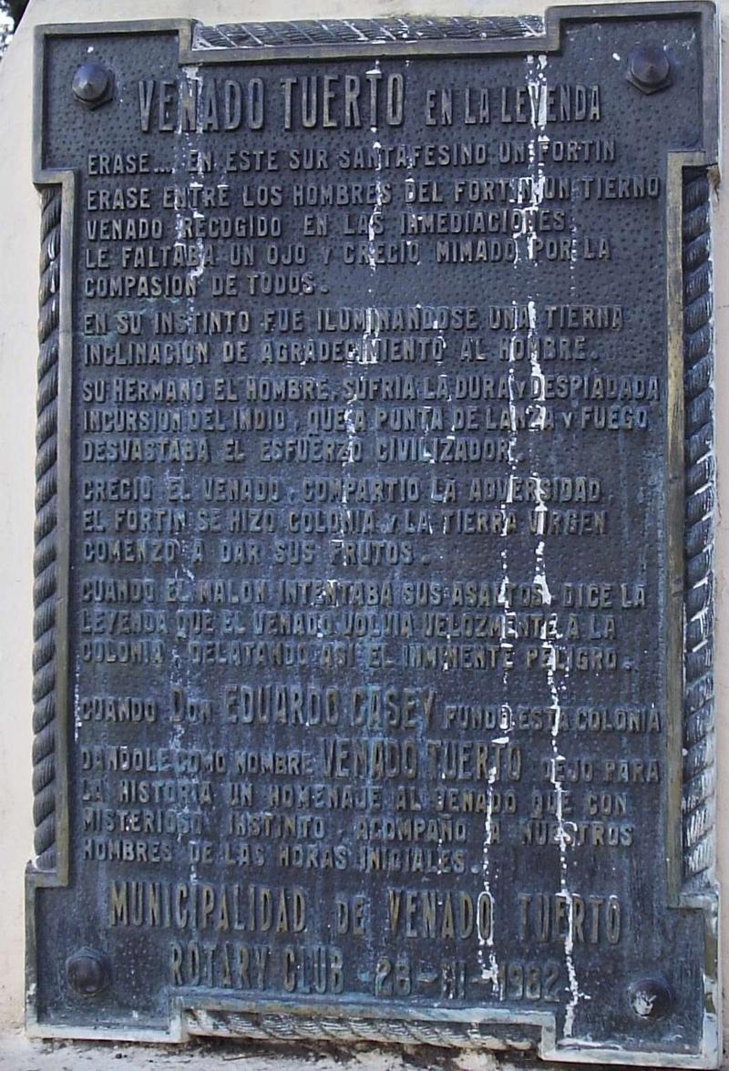 Cuando Don Eduardo Casey fundó esta colonia dándole como nombre VENADO TUERTO dejó para la historia un homenaje al venado que con misterioso instinto acompaño a nuestro hombres de las horas inicialesMunicipalidad de Venado Tuerto — Rotary Club — 28 de Noviembre de 1982