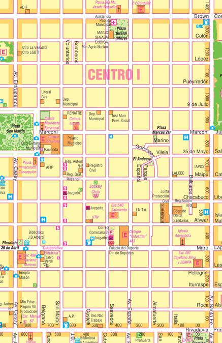 Edificio de la Escuela Normal Plaza San Martín Escuela especial Mº 206 - CANEA Rivadavia 98-Te 42 1390  Esc 497-Cayetano Silva - Pellegrini 71 Te 42-1330 - Ver También EEMPA Iglesia Adventista del 7º día Hotel Santa Fe - Santa Fe 540 - Te 42 0922 Hotel Bahú - Marconi 108 - Te 42-4565 Parque Municipal Gral. Belgrano -  Jujuy 79 - 43-6379 Hotel Stitlea - Saavedra 889 - Te 42-2994 Escuela Educación Manual 62-Rivadavia 873-Te 42 2857  Edificio del Teatro Ideal Albergue del Centro Empleados de Comercio - 9 de Julio 943 - Te 42-1307 Casa Histórica y Museo Cayetano Silva - Maipú 966 - Te 43 1163 Escuela Normal - Estrugamou (1)250 -Te 42 1514 Parque Municipal Gral. Belgrano -  Jujuy 79 - 43-6379 Teatro Ideal Jockey Club - Castelli 657-TE 40 0377 Planta de Pavimento Municipal - Santa Fe 1395 - Te 40-0379 INFEM - Brown 853 - Te 43-9159 Registro de la Propiedad del Automotor Nº 1 - Casey 78 - Te 42-0260 Registro del Automotor Nº 3 - Chacabuco 98 - Te: 43-2277 Centro Educativo Municipal para no Videntes-9 de Julio 530-Te 43 6376 Inst Municipal de Previsión Social - 9 de Julio 498 - Te 42-1518 Ministerio de Educación y Cultura - Región VII - Rivadavia 873 - Te: 42-1713/43-0114/43-4188 API-Adm Pcial de Impuestos - San Martín 75 - Te: 42-1979 Bomberos Voluntarios-Italia 570- TE Emergencias 420 420 Plazoleta Miguel Andueza Plazoleta Marcos Zar Plaza Fleming Secretaría de Estado de Trabajo y Seguridad Social - Rivadavia 515 - Te 43-2270 Cooperativa de Obras Sanitarias - Administración - Italia 555 - Te 43-8200 Est de Serv Shell -Te 42-2021 Estación de servicio Ampliar plaza Mitre Esquina de Belgrano y Mitre Zona de servicios Alrededores plaza San Martín Zona Rural Noreste 1 Centro 2 San Cayetano General Belgrano Centro 3 Norte San José Obrero